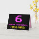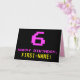 A frente deste design de cartão de saudação de aniversário divertido, geek e nerdy apresenta um grande número "6" e a mensagem "HAPPY BIRTHDAY", cor-de-rosa, juntamente com um nome de destinatário personalizado amarelo arrojado. O texto tem uma aparência inspirada pelo estilo clássico de 8 bits de gráficos de jogos de computador e vídeo dos anos 70 e 80, e o fundo é preto colorido. O dentro apresenta uma mensagem de saudação de aniversário personalizada, ou talvez possa ser apagado e deixado vazio se uma mensagem for escrita manualmente. Um cartão de aniversário personalizado de bobo como este pode ser uma maneira divertida de reconhecer o sexto aniversário de alguém. [~Z0000478]