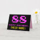 A frente deste design de cartão de saudação de aniversário divertido, geek e nerdy apresenta um grande número "88" e a mensagem "FELIZ BIRTHDAY", cor-de-rosa, juntamente com um nome de destinatário personalizado amarelo arrojado. O texto tem uma aparência inspirada no estilo retro de 8 bits de gráficos de jogos de computador/vídeo dos anos 70 e 80, e o fundo é preto colorido. O dentro tem uma mensagem de saudação de aniversário personalizada, ou talvez pudesse ser apagado e deixado vazio se uma mensagem for escrita manualmente. Um cartão de aniversário personalizável como este pode ser uma maneira divertida de reconhecer o oitavo aniversário de alguém. [~Z0000478]