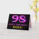 A frente deste design de cartão de saudação de temas divertidos, geek e nerdy aniversário apresenta um grande número "98" e a mensagem "FELIZ BIRTHDAY", cor-de-rosa, juntamente com um nome de destinatário personalizado amarelo ousado. O texto tem uma aparência inspirada no estilo clássico de jogos de vídeo e gráficos de jogos de computador de 8 bits dos anos 70 e 80, e o fundo é preto colorido. O dentro tem uma mensagem de saudação de aniversário personalizada, ou talvez pudesse ser apagado e deixado vazio se uma mensagem for escrita manualmente. Um cartão de aniversário personalizado de bobo como este pode ser uma forma divertida de celebrar o oitavo aniversário de alguém. [~Z0000478]
