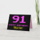 A frente deste design de cartão de saudação divertido, nerd e geeky aniversariante apresenta um grande número "91" e a mensagem "HAPPY BIRTHDAY", cor-de-rosa, juntamente com um nome de destinatário personalizado amarelo arrojado. O texto apresenta uma aparência inspirada pela dos gráficos retrorados de jogos de vídeo/computador do estilo 8-bits das décadas de 1970 e 1980, e o fundo é preto colorido. O dentro apresenta uma mensagem de saudação de aniversário editável, ou talvez pudesse ser apagado e deixado o vazio se uma mensagem fosse escrita manualmente. Um cartão de aniversário personalizado de bobo como este pode ser uma maneira divertida de enviar uma mensagem celebrando o 90° aniversário de alguém. [~Z0000478]