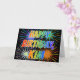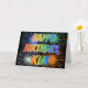 Estas características coloridos e do divertimento do aniversário do cartão de design a mensagem "FELIZ ANIVERSARIO," e o nome comum "KIM" com as letras que têm um espectro colorido do arco-íris gostam do teste padrão da coloração do inclinação. O fundo da parte dianteira igualmente caracteriza um teste padrão colorido inspirado pelo olhar de estourar fogos-de-artifício comemorativos. As características internas uma mensagem de cumprimento personalizada, ou poderiam talvez ser canceladas e sairiam do vazio se uma mensagem deve ser escrita à mão pelo contrário. Um cartão como este podia ser uma maneira do divertimento de reconhecer o aniversário de alguém Kim nomeado. [~Z0000350]