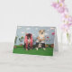 Este cartão é um cartão do aniversário apropriado para qualquer um. É uma foto de um cão masculino em um uniforme do futebol, guardarando um futebol, a fêmea é um cheerleader. A mensagem interna diz "o aniversário feliz a uma equipa vencedora!"
