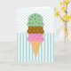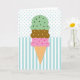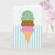 Características deste design um cone triplo do sorvete da colher (morango, pedaços de chocolate brancos do chocolate e pedaços de chocolate da hortelã) em uma luz - bolinhas azuis e fundo listrado. Personalize este cartão para convites de festas, cartões de nota ou qualquer coisa que você gostaria!
