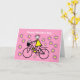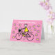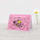 Desenho animado fofo apresentando uma mulher andando de bicicleta com seu gato andando na cesta. O cartão tem um fundo rosa com flores. Ótimo cartão para enviar no Dia das Mães. Personalize facilmente este cartão editando o texto do modelo. Obrigado por ver meus desenhos animados!