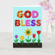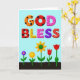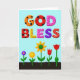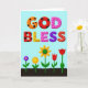 Este cartão de cumprimentos apresenta uma ilustração digital com o grande texto de duas linhas “DEUS ABENÇOE” centralizado perto do topo em letras tridimensionais e arredondadas que parecem tão doces e amigáveis quanto guloseimas compartilhadas ❤️. As palavras estão sobre um fundo azul-cerúleo suave, dando à mensagem muito espaço aberto para respirar. Cada letra tem seu próprio padrão decorativo: letras laranja quente e vermelho profundo carregam bolinhas pretas, enquanto letras amarelo ensolarado e rosa são polvilhadas com minúsculas manchas vermelhas como confetes. Uma letra roxa profunda é pontilhada com manchas mais escuras, e o “S” vermelho final se destaca com linhas finas no estilo de costura branca que sugerem cuidado e proximidade. Abaixo do texto, uma faixa marrom escura de terra se estende pela parte inferior, como um canteiro de jardim simples pronto para uma pequena celebração. Deste solo surgem cinco flores estilizadas em hastes verdes finas, suas formas inclinadas umas para as outras de uma maneira suave e companheira 🌼. As flores incluem uma pequena flor roxa com centro dourado, uma flor