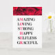 A frente deste cartão do Dia das Mães tem uma fotografia de rosas vermelhas e a sigla para MÃE, maravilhosa, amorosa, forte, feliz, altruísta, graciosa. O interior diz "Feliz Dia das Mães" e um local para personalizar com sua própria mensagem.