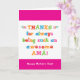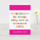 Você chama sua mãe de Amá, não Mamãe. (Amá significa mãe em espanhol.) Imagine como Amá ficará animada ao receber um cartão do Dia das Mães dirigido especialmente a ela! Sua amá também vai adorar o design divertido e colorido baseado em texto deste cartão, que diz "Obrigado por sempre ser uma Amá tão incrível! Feliz Dia das Mães!"