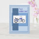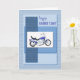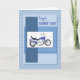Um ótimo cartão para o Dia dos Pais. Uma moto azul sobre um fundo azul abstrato. A frente diz "Feliz Dia dos Pais". Um ótimo cartão para alguém que é um entusiasta de motocicletas. As texturas na frente deste cartão são impressas.