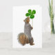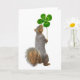 Um esquilo segura um trevo de quatro folhas. Envie este cartão de esquilo fofo para o Dia de São Patrício.