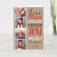 O costume disponível imprimiu cartões com fotos do feriado com modelos simples para a personalização. Este design rústico moderno tem uma mistura festiva de tipografia no vermelho, no branco e nas cinzas em um fundo do papel de embalagem do falso. O fraseio diz o amor, a paz, o elogio do feriado, a alegria, e o Feliz Natal. Personalize-o com as 4 de suas fotos ao longo do lado e adicione-o seu nome de família e o ano. Dentro de tem o espaço para fotos e o texto adicionais. Use as ferramentas de design para editar o texto, adicione mais fotos e criar original de um design de cartões de foto de Natal amável.