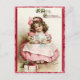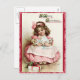 Este é um cartão delicioso do vintage de uma menina doce em um vestido cor-de-rosa. Tem um arco cor-de-rosa em seu cabelo e está embalando sua boneca bonito em seus braços. Na frente dela no assoalho é um presente envolvido do Natal. O cartão lido: "Feliz Natal". Um cartão velho lindo do Natal!