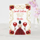 Este doce convite de 16 anos apresenta uma elegante estrutura de ouro, uma bela princesa de cabelo castanho e um vestido vermelho, flores e um balão.