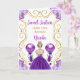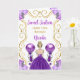 Este doce convite de 16 anos apresenta uma elegante estrutura de ouro, uma bela princesa com cabelo louro e um vestido roxo, flores e um balão.
