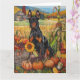 Celebre a beleza do outono com esta pintura vibrante de um cão sentado ao lado de uma bela colheita de Ação de Graças. As ricas cores do outono de abóboras, girassóis e paisagem rural rústica criam uma atmosfera quente e convidativa, perfeita para a decoração sazonal de qualquer amante de cachorro.