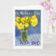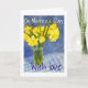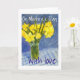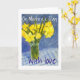 Um cartão do dia das mães com um vaso de vidro de daffodils dourados em um azul e em um branco verificou o pano de mesa, de uma pintura pastel do óleo original. O texto dianteiro lê, "no dia das mães, com amor" e o interior é deixado vazio para sua própria mensagem.