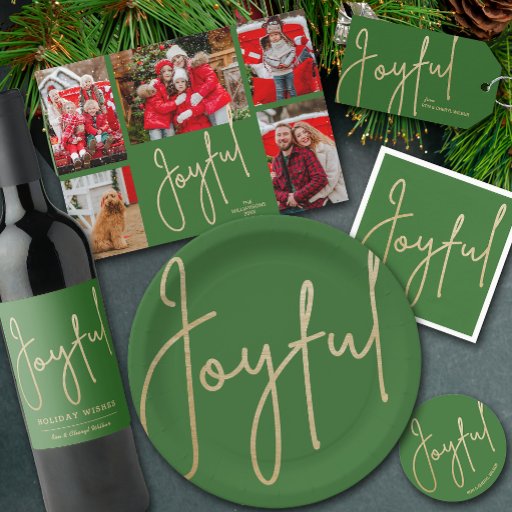 A palavra Joyful em um guião de ouro em chic em um fundo verde na frente, estes cartões de saudação de Natal dobrados apresentam sua foto favorita, saudação e personalização no dentro. CORRESPONDENTE a itens e mais cores na nossa coleção.
