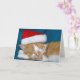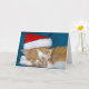 Boné de Papai Noel vermelho e branco sobre o gato de mesa de ouro dormindo.