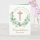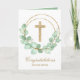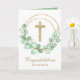 Uma cruz falsa dourada e uma coroa de folhas de eucalipto destacam este cartão de saudação religioso. Perfeito para batismo ou batizar. Personalize o dentro ou saia como está. Itens CORRESPONDENTES disponíveis em nossa loja.