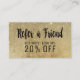 Moderno e glamoroso o ouro impresso este falso e o brilho engrenam o inclinação, consultam um amigo o cartão da referência que do disconto é perfeito para o proprietário empresarial na moda e à moda. Este cartão de vista elegante e profissional é a maneira perfeita de mostrar seus clientes que você se importa com seu negócio. Personalize este cartão para todo o negócio, apenas edite o texto e adicione seus próprios detalhes pessoais.
