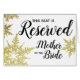 Certifique-se de que sua festa de casamento consiga seus assentos em sua cerimônia criando um sinal 'Reservado' personalizado para cada um de seus VIPs. Com um design de floco de neve bonito e efeito impresso de folha de ouro, este sinal 'Reservado' corresponde perfeitamente ao resto da Dourada coleção de estórias de flocos de neve.