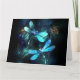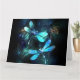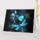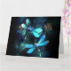 Duas libélulas transparentes, luminosas, turquesas, desenhadas artisticamente sobre fundo noturno, com algas e vagalumes luminescentes do lago. Dragonfly brilhante.