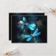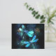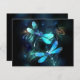 Duas libélulas transparentes, luminosas, turquesas, desenhadas artisticamente sobre fundo noturno, com algas e vagalumes luminescentes do lago. Dragonfly brilhante.
