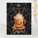 É a estação de especiarias de abóbora! Esta design apresenta uma imagem gráfica fofa de um latte de picada de abóbora numa caneca em forma de jack-o-lanterna com uma teia de aranha no fundo. Se você optar por editar o design personalizado, poderá alterar a cor de fundo, o texto, as fontes, bem como ajustar ou mover as imagens. O dentro foi deixado como vazio, no entanto, você pode adicionar texto facilmente durante a edição clicando no botão "adicionar texto".