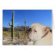 Uma imagem fotográfica de um buldogue inglês branco é mostrada no meio dos cactos impressionantes do saguaro no deserto de Sonoran.