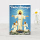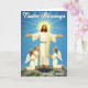 Designed with a robed, kind-faced man at the center, this digital illustration shows him standing on an old stone bridge with his arms open as if welcoming someone close. A radiant golden sunburst circles his head, sending warm rays into a blue-to-teal sky that feels calm and intimate. Three small, childlike winged figures kneel on either side, their hands clasped and their upward gazes meeting his gentle attention in a way that reads like quiet affection and care 🐰. The bridge looks weathered and touched with moss, while a deep blue drop beneath it adds a sense of hush and distance. At the top, the words “Easter Blessings” sit in flowing cursive lettering in a light tone that stands out against the sky. Near the bottom, “For you, Mother” appears in smaller, delicate cursive text, placed low and centered like a private note 🌷. Green foliage edges the scene around the bridge, contrasting with the dark space below and the golden rays above.