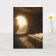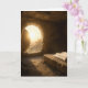 An empty tomb with an open entrance lets sunlight pour in, illuminating a stone slab that holds neatly folded burial shrouds.