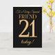 Um cartão de aniversário de 21 anos de chic para um "amigo muito especial", com um número 21 composto por números de efeito ouro e a palavra "amigo", em efeito ouro, sobre fundo preto. A mensagem dentro, que podem mudar se quiserem, é "Parabéns"