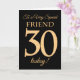Um cartão de aniversário de 30 anos de chic para um "amigo muito especial", com um número 30 composto por números de efeito ouro e a palavra "amigo", em efeito ouro, sobre fundo preto. A mensagem dentro, que podem mudar se quiserem, é "Parabéns"
