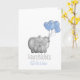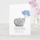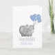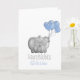 Cartão de bebê de parabéns personalizados mostrando um elefante com balões azuis. O nome da nova mãe e pai, o ano de nascimento e a mensagem dentro pode ser personalizado. Esta design ilustre e fofa é perfeita para novos pais.