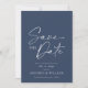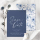 Anuncie seu dia especial com estilo com este Cartão Elegante de Floral Azul para Salvar a Data. Com uma escrita branca sofisticada em um fundo azul-marinho profundo, este cartão exala charme atemporal. O verso apresenta um delicado padrão floral azul, adicionando um toque romântico. Perfeito para casamentos, noivados e celebrações formais, este cartão de Salvar a Data garante que seus convidados marquem suas agendas para o seu evento inesquecível.