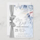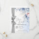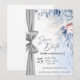Anuncie seu dia especial com elegância atemporal usando este cartão de Save the Date em aquarela de luxo, lindamente projetado com flores em tons de azul suave e rosa e um sutil detalhe em fita prateada.