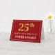 A frente deste design de cartão de saudação com tema de aniversário luxuoso e rico apresenta um grande número ordinal "25" com uma aparência inspirada em imitação/falsa ouro, a mensagem "HAPPY 25 BIRTHDAY", um nome de destinatário personalizado e um padrão de borda que consiste em linhas finas em um fundo vermelho colorido. O dentro apresenta uma mensagem de saudação de aniversário personalizada, ou talvez possa ser apagado e deixado vazio se uma mensagem for escrita manualmente. Um cartão de saudação de aniversário editável como este poderia ser enviado para celebrar o vigésimo quinto aniversário de alguém. [~Z0000467]