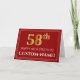 A frente deste rico e elegante design de cartão de saudação com tema de aniversário apresenta um grande número ordinal "58º" com uma aparência inspirada em imitação/falsa ouro, a mensagem "FELIZ 58º ANIVERSÁRIO", um nome de destinatário personalizado e um padrão de borda que consiste em linhas finas sobre um fundo vermelho. O dentro apresenta uma mensagem de saudação de aniversário personalizada, ou talvez possa ser apagado e deixado o vazio se uma mensagem for escrita manualmente. Um cartão de saudação de aniversário personalizado como este pode ser usado para reconhecer o quinquagésimo oitavo aniversário de alguém. [~Z0000467]