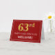 A frente deste design de cartão de saudação com tema de aniversário luxuoso e rico apresenta um grande número ordinal "63. º" com uma aparência inspirada em imitação/falsa ouro, a mensagem "FELIZ 63. º ANIVERSÁRIO", um nome de destinatário personalizado e um padrão de borda que consiste em linhas finas sobre um fundo vermelho. O dentro apresenta uma mensagem de saudação de aniversário personalizada, ou talvez possa ser apagado e deixado o vazio se uma mensagem for escrita manualmente. Um cartão de cumprimentos de aniversário personalizado como este pode ser uma maneira elegante de entregar cartões de aniversários a alguém que comemora seu sexagésimo terceiro aniversário. [~Z0000467]