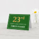 A frente deste design de rico de cartão de saudação de aniversário elegante e de aniversário apresenta um grande número ordinal "23. º" com um aspecto de inspiração falsa/imitação de ouro, a mensagem "FELIZ 23. º ANIVERSÁRIO", um nome de destinatário personalizado e um padrão de borda que consiste em linhas finas num fundo de cor verde. O dentro apresenta uma mensagem de saudação de aniversário editável, ou talvez pudesse ser apagado e deixado o vazio se uma mensagem fosse escrita manualmente. Um cartão de saudação de aniversário editável como este poderia ser usado para reconhecer o vigésimo terceiro aniversário de alguém. [~Z0000481]