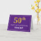 A frente deste elegante e rico design de cartão de saudação com tema de aniversário apresenta um grande número ordinal "50º" com uma aparência falsa/imitação de ouro inspirada, a mensagem "FELIZ 50º ANIVERSÁRIO", um nome de destinatário personalizável, e um padrão de borda composto por linhas finas, sobre um fundo de cor roxa. O dentro apresenta uma mensagem de saudação de aniversário personalizável, ou talvez possa ser apagado e deixado o vazio se uma mensagem for escrita manualmente. Um cartão de saudação de aniversário personalizado como este pode ser uma maneira elegante de entregar cartões de aniversários a alguém que comemora seu quinquagésimo aniversário. [~Z0000484]