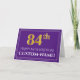 A frente deste respeitável e elegante design de cartão de saudação com tema de aniversário apresenta um grande número ordinal "84º" com um olhar inspirado em imitação/falsa ouro, a mensagem "FELIZ 84º ANIVERSÁRIO", um nome de destinatário personalizável, e um padrão de borda composto por linhas finas, sobre um fundo cor roxa. O dentro apresenta uma mensagem de saudação de aniversário personalizada, ou talvez possa ser apagado e deixado vazio se uma mensagem for escrita manualmente. Um cartão de saudação de aniversário personalizado como este pode ser uma maneira elegante de entregar uma mensagem de saudação de aniversário a alguém que está celebrando seu oitenta e quarto aniversário. [~Z0000484]