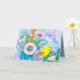 Um cartão de boas-vindas em breve com um pássaro amarelo brilhante empoleirado num galho com um bonito buquê floral com flores cor-de-rosa, laranja e roxo.