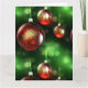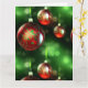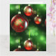 Trabalho artístico em dourado e verde decora festivamente os enfeites de Natal vermelhos neste close-up detalhado. Estes enfeites sofisticados de bola de vidro pendem em fita verde na frente de um fundo abstrato de folhagens e luzes de Natal. Uma maneira elegante de desejar Feliz Natal! PERSONALIZE com seu próprio cumprimento de Natal no interior do cartão.
