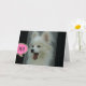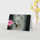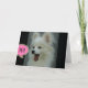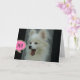 Foto bonito e engraçada de um filhote de cachorro branco de Pomeranian com o largo aberto da boca e do grito out- olá!! em um cartão com texto customizável para dentro. © poucos foto & design da asa
