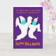 Cartoon mostrando dois fantasmas bonitos vestindo máscaras faciais com a legenda 'Por alguma razão, não me sinto tão assustador como no ano passado!' O cartão diz "Feliz Dia das Bruxas" na frente e o dentro diz "Tenha uma noite de excelente". Personalize facilmente este cartão editando qualquer texto modelo.