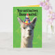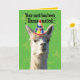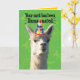 Linda lama vestindo um chapéu de festa contra um passado de aniversário festivo. O cartão diz, "O seu cartão foi iluminado. Entendeu? O dentro diz, "Se você derramar suas bebidas ou deixa cair comida nela... sem problemas! Feliz aniversário!" Mais jogue a palavra lama. Por todos os amantes de Lama!