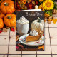 Cartão de saudação do tema do outono bonito dizendo, "Enviando suas Bênçãos de outono" para um amigo ou membro da família. Uma ilustração ai de uma cena de outono brilhante com um pedaço de torta de abóbora e creme chicoteado numa placa de colheita de rico, uma caneca de cacau quente com creme chicoteado e uma abóbora branca cercada por paus de canela e fatias de laranja secas.
