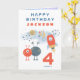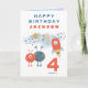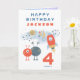 Envie a uma criança de 4 anos que adora aliens e desejos de feliz aniversário no espaço com esta espaçonave, personagens bonitos de alienígena e lua e estrelas design num fundo branco. Personalize facilmente o texto de acordo com suas próprias necessidades.