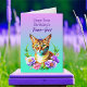 Gato de aquarela e flores bonitos no cartão de aniversário chato e púrpura, Cartão de aniversário de Gata é para amigo. Dentro é uma página colorida.