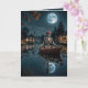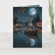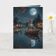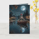 Um esqueleto vestindo um boné vermelho de beisebol se senta em um pequeno barco em um canal iluminado por lua tranquilo, com armações aconchegantes enrolando a costa